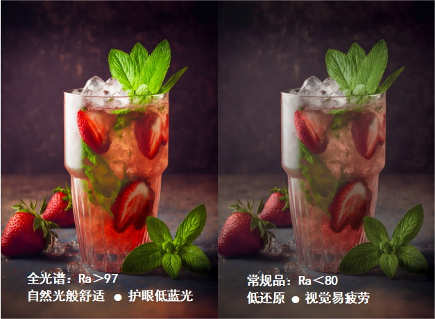 光源的顯色指數Ra是衡量光源對(duì)于色彩還(hái)原的能(néng)力,其數值越接近100,越能(néng)還(hái)原色彩真實性,并且飽和度高,給人的感覺越舒适。鴻利智彙集團旗下子公司斯邁得半導體打造的全光譜産品,Ra值已達97以上,相較市面(miàn)常規高顯指産品進(jìn)一步提升光源的顯色質量,提升使用者的舒适感。